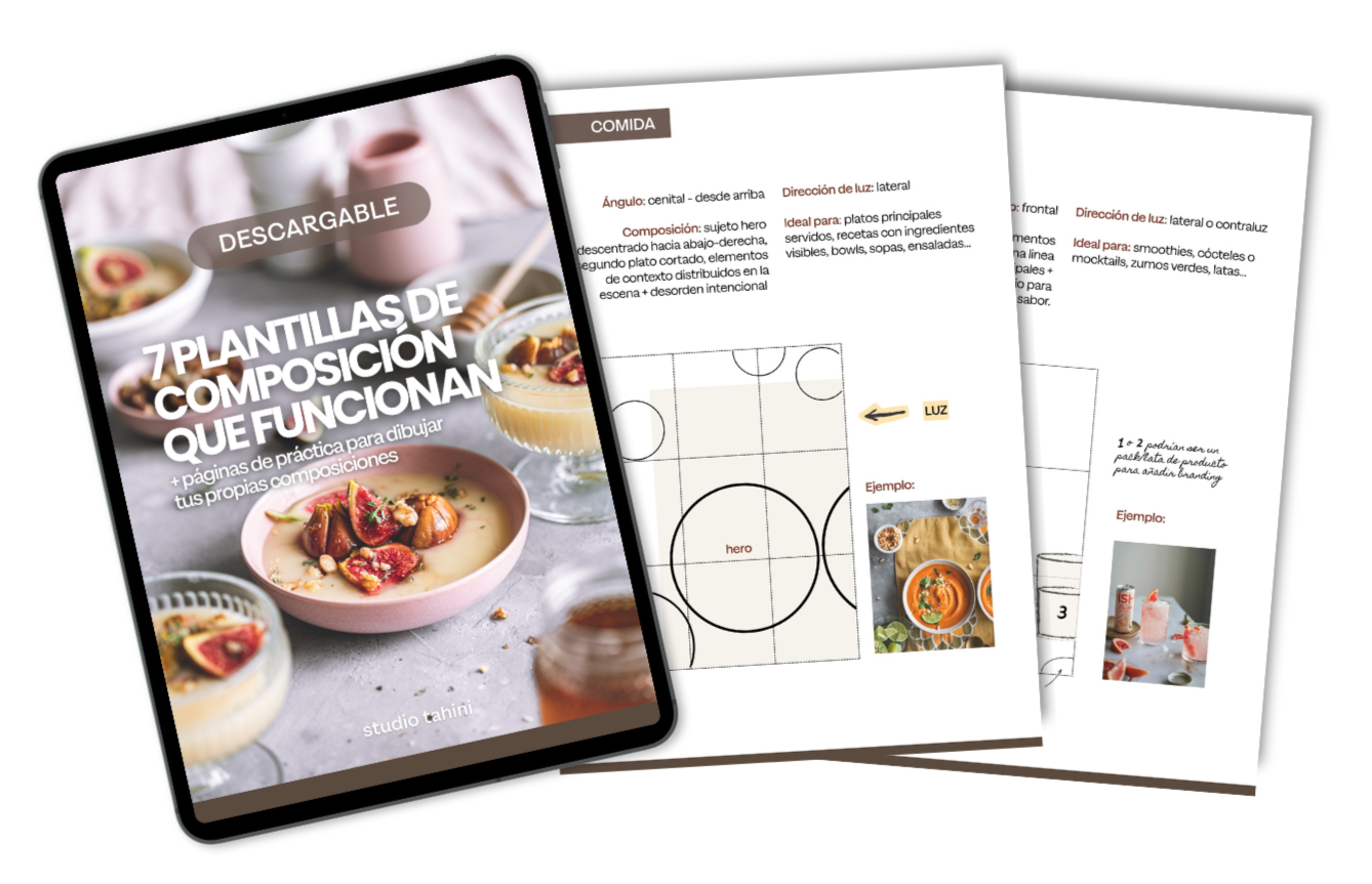 Esto es lo que abro yo cuando necesito arrancar sin perder tiempo. Más de 50 composiciones visuales para food y producto, organizadas y listas para usar en cualquier sesión. La teoría detrás la enseño en el curso. Aquí solo necesitas descargar y empezar.